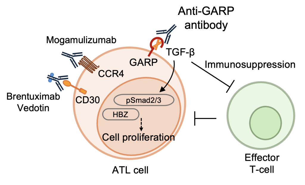 ATL細胞やHTLV-1感染細胞においてGARPという分子が細胞表面に発現し、TGF-bシグナルを誘導することで、①感染細胞の増殖誘導、②免疫環境を抑制、の2つを機能を同時に発揮する新たなメカニズムを発見しました。GARPは新たな治療標的候補として有望であることも示しました。